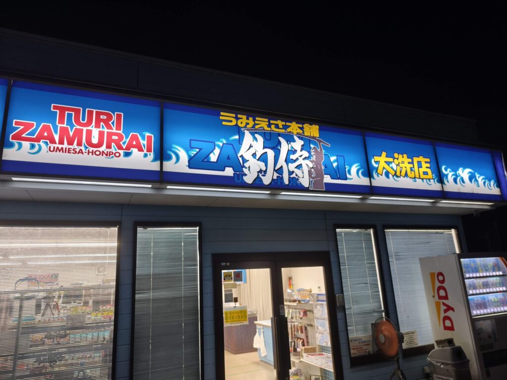 場所は茨城県の那珂湊。道中に雨が降ったりやんだりする中、天候の不安に襲われつつ心の安定をもたらしてくれる青いライティングでお馴染みの釣具屋さんに到着です。